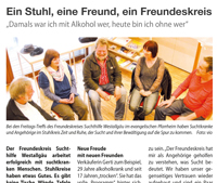 Der Freundeskreis Westallgäu Suchtkrankenhilfe wurde im März 1978 gegründet und hielt am 14.04.1978 seine erste Gruppenstunde mit 8 Teilnehmern ab. Auf den Tag genau am 14.04.2018 fand unsere 40-Jahrfeier statt. Pfarrer Martin Strauß hielt den Festgottesdienst. Es warein sehr schöner Gottesdienst mit einer bewegten Predigt... Lesen Sie den kompletten Artikel (PDF 400 KB)